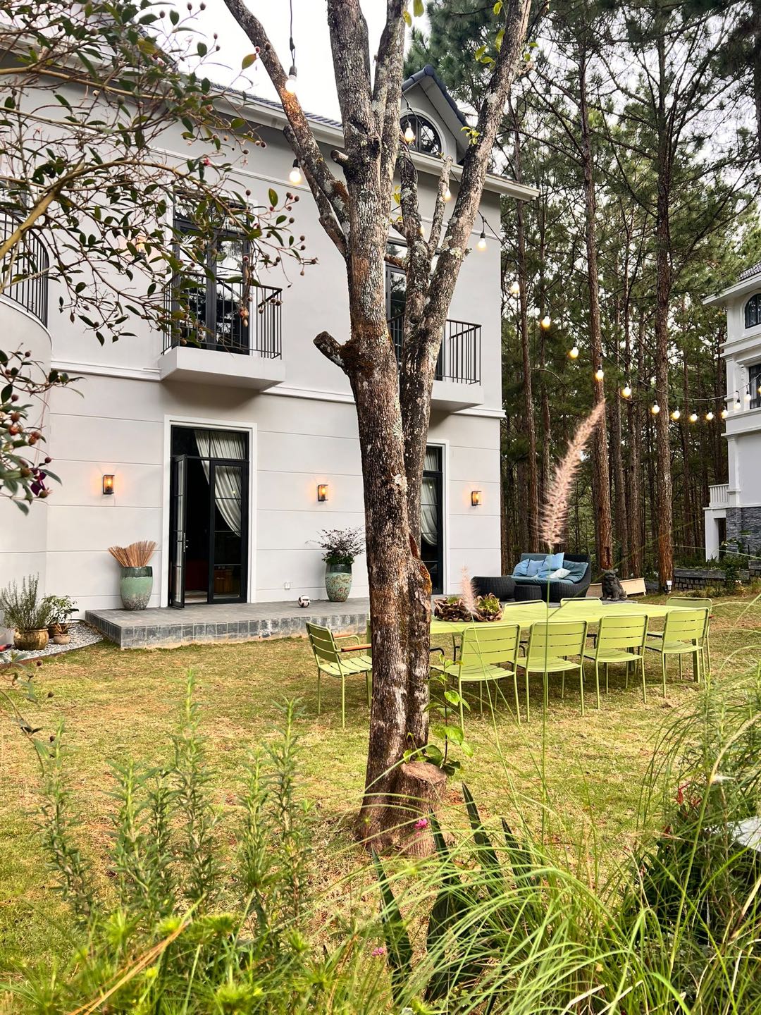 “An outdoor dining space that embraces a relaxed, nature-connected atmosphere, featuring a table and seating set arranged on a green lawn. The design focuses on casual living experiences, where people can gather, enjoy meals, and comfortably immerse themselves in the open air.”